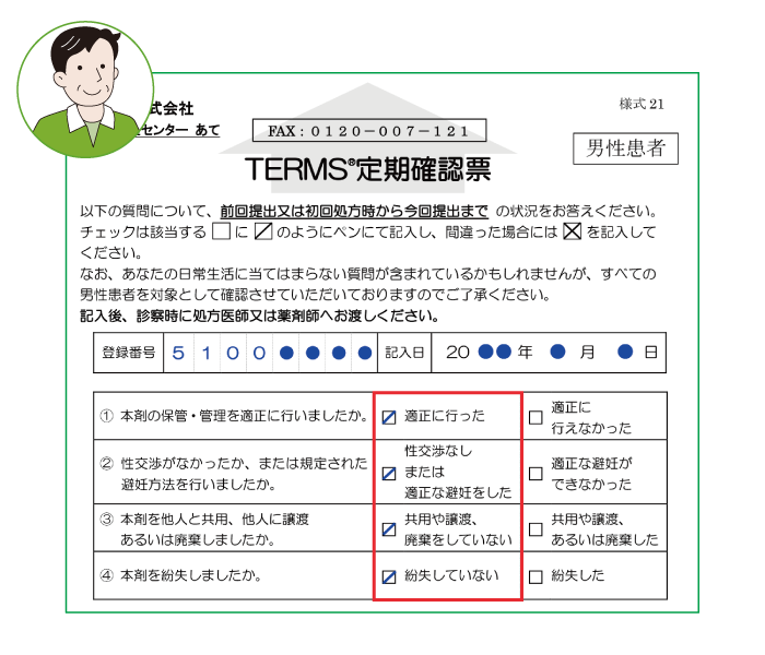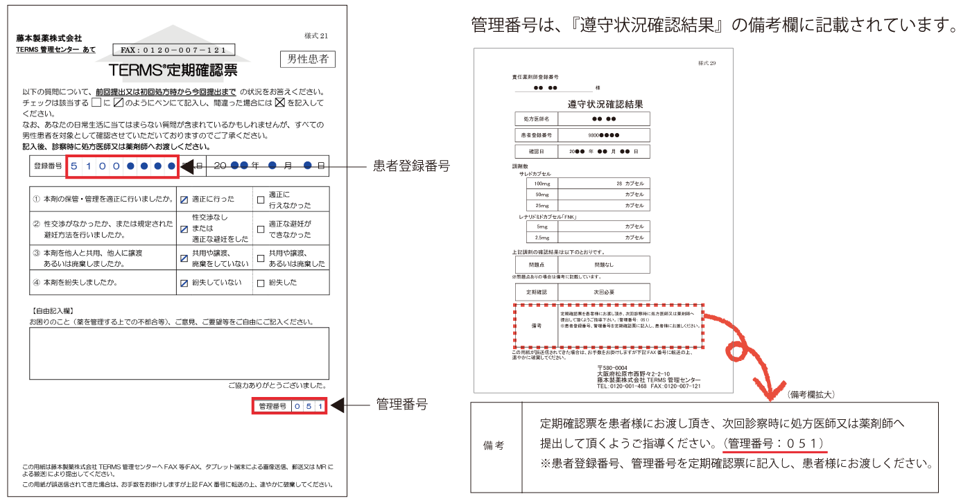 『遵守状況確認結果』と一緒に『定期確認票』が必要との通知を受け取った場合は、『定期確認票』へ患者登録番号及び管理番号をご記入後、患者さんへお渡しいただき、次回診察時に処方医師又は薬剤師へ提出するようお伝えください。