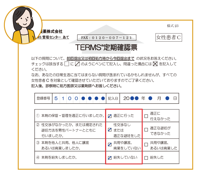 患者群ごとのリスクに応じ、避妊に関する状況及びサリドマイド製剤等の保管状況等について、患者さん自身により定期確認票を用いて定期的に自己評価を実施していただきます。